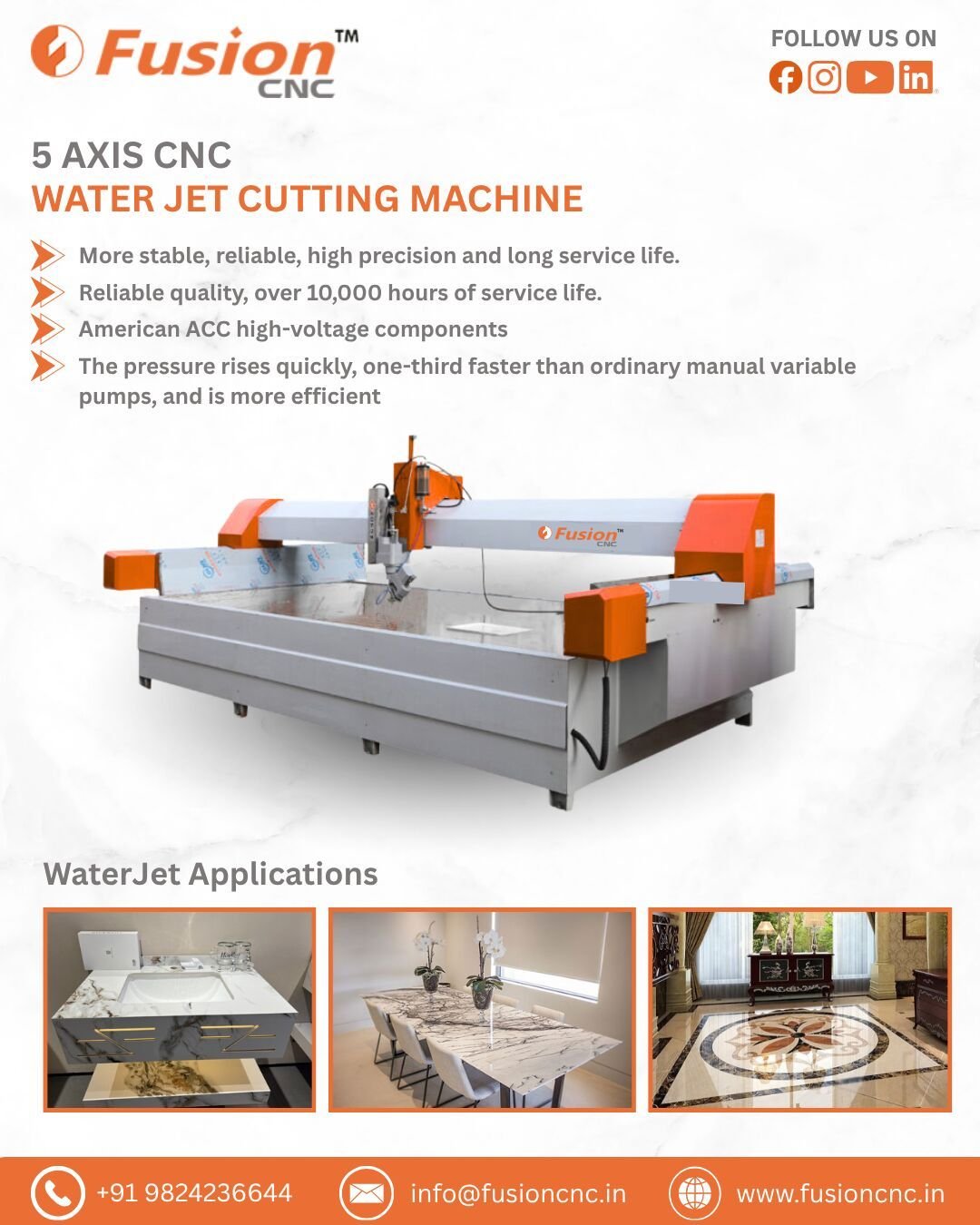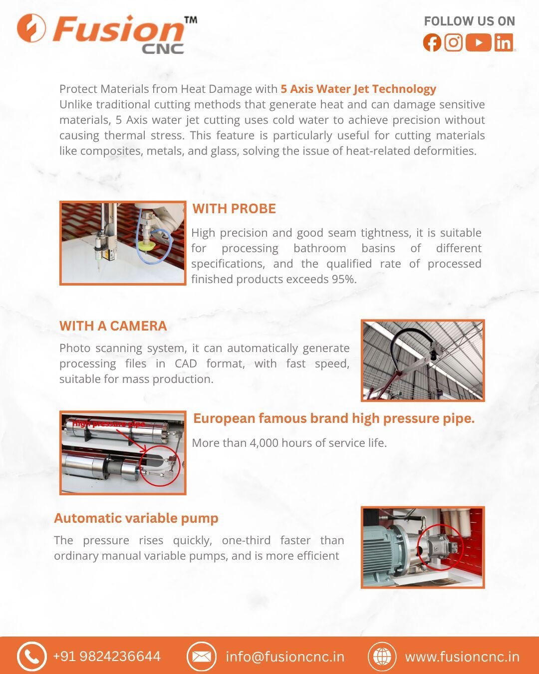 The water jet cutter is widely used in a variety of applications because it is a versatile and efficient process that accurately cuts a variety of materials regardless of shape or thickness.The cutting width is narrow and will not generate stress or heat.Clean cutting, no slag, uniform and smooth edges. Compared with other processes, fast cutting does not require sharp tools. It is a perfect complement to high precision machine/tool work, making dimensions closer to each other to reduce processing time. It is an easy-to-use and environmentally friendly process because it does not generate heat, dust or smoke.